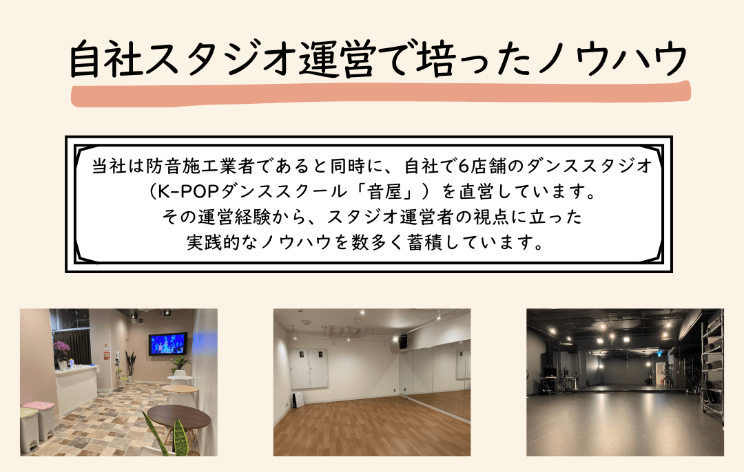 防音工事は、単なる騒音対策ではなく、最高の音環境をつくるための重要な投資です。当社「音屋」は、防音施工とスタジオ運営の両方で培った豊富な経験を活かし、物件条件や用途に応じた最適なプランをご提供します。快適かつ安心してダンスができるスタジオづくりを全力でサポートします。