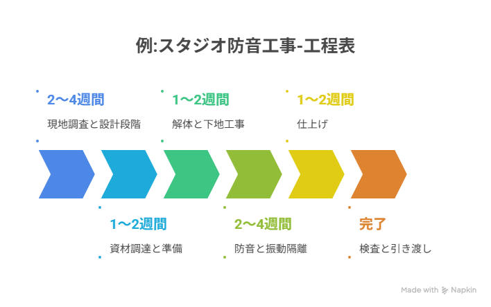 A. 標準的なスタジオ防音工事なら1~2ヶ月程度が目安です。小規模であれば数週間、大規模・高性能を要する場合は2ヶ月超かかることもあります。設計準備期間も含めると、ご依頼から完成まで約2~3ヶ月余裕を見ると確実です。開業予定日がある場合は逆算して早めに準備されることをおすすめします。